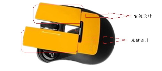 因兩種鼠標處有無線區別在,其他構造基本相識。按鍵設計在鼠標前頭上部,左右各一個,便于兩指尖任意點擊。通過人工對指尖測量,鼠標按鍵大小為:長2.5-2.8,寬1.5-18范圍。在兩按鍵指尖還帶有滑動按鍵,成圓餅狀,有三分之二鑲嵌在鼠標內,滑動按鍵半徑在0.2CM左右。按鍵外殼為硅膠材質包裹,確保滑動不刮手。